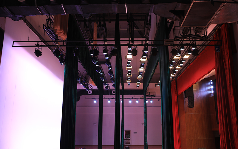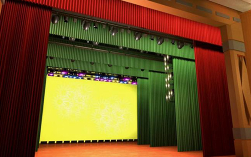 侧帘幕(侧条幕):侧帘幕位于舞台左右两侧,颜色与横帘幕一致,其对舞台表演区域起限制作用,其平行、正“八”字、倒“八”字等吊装方式可以改变舞台表演区平面的形状,对舞台后部空间进行遮挡,引导、控制观众的视线集中在规定的表演区内。其主要是美化舞台,遮挡观众对侧台的视线。